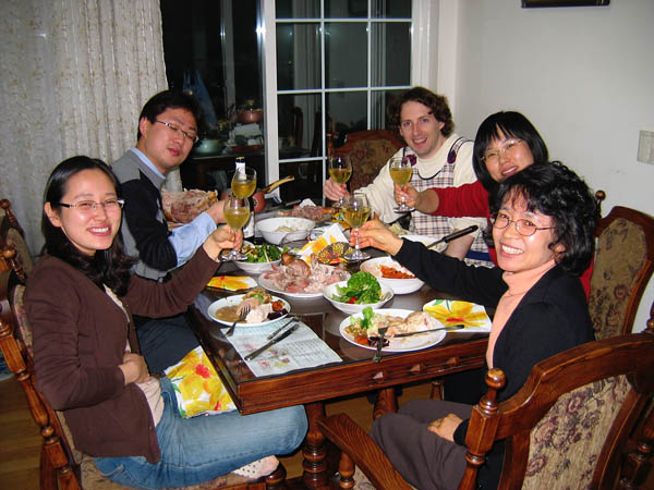 Even though I was technically the head chef, everyone in this photo pitched in. Hyunjin (to my left) was in charge of most of the vegetable dishes, Hyundeok (front left) and “little aunt” (front right) were all-around assistants who handled thankless tasks such as potato-peeling. Eunho, Hyundeok’s husband, mashed the potatoes and helped me make the gravy (I did it roux-style, and with the amount of liquid involved it’s really hard to do it alone—unless you have three hands). We’re all pretty beat here, but we’re also glad that it’s over and we finally get to eat. I’m sure slaving all day in a hot kitchen had something to do with it, but everything was delicious.