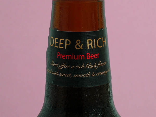 I wanted to provide a close-up of this particular part of the bottle, because the marketing copy here is going to come into play very shortly (I also switched to a pink background to avoid “light bleeding” from the white background, and also because pink is a manly color). In case the script is a bit difficult to read (especially at the curving edges), beneath “Premium Beer” it says: “Stout offers a rich black flavor topped with sweet, smooth & creamy head.” I winced a bit at “black flavor,” but as we’ll soon see that’s by no means the worst of it.