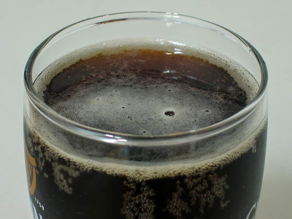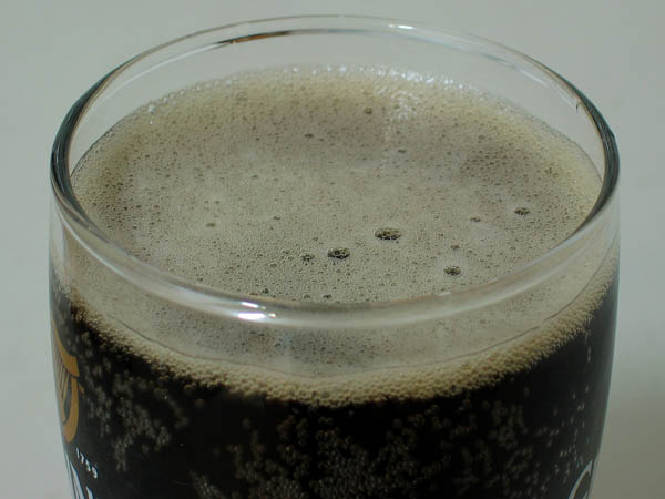 So let’s get the obvious out of the way: this beer does not even come close to a stout. The copy on the top label? A blatant lie, to put it nicely. Now that we’ve established that, I’d like to drop the issue of what the beer isn’t for now and just focus on what the beer is. Let’s start with appearance. As you can see from the previous two photos, it is rather dark. In direct light it looks almost black, but at the edges you can see that it’s actually a very deep brown. In fact—and I realize that this will destroy any credibility I might have, but oh well—it looks very much like root beer. The carbonization is very visible, again as you can see in the previous photographs.