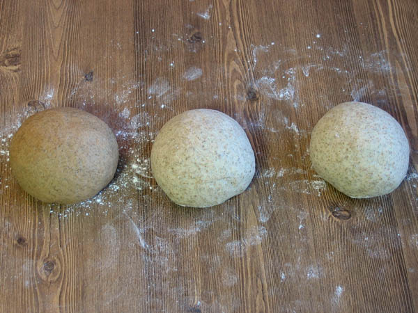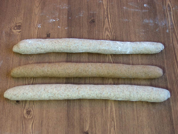 Here are the three balls of dough that will soon become the three strands of the braid. As you can see, the one on the left is the pumpernickel. It’s actually a light pumpernickel of my own design, flavored and colored with molasses and cocoa (real pumpernickel is made with a sourdough starter and baked at a very low temperature for a very long time—sometimes up to 24 hours). Other than that, it is identical to the regular rye loaf (which has honey rather than molasses, and no cocoa). The rye flour I used is a dark rye imported from the States. The brand is “Bob’s Red Mill,” which is the same brand I use for my whole wheat flour (Korean whole wheat flour is way too finely ground and refined for my taste).