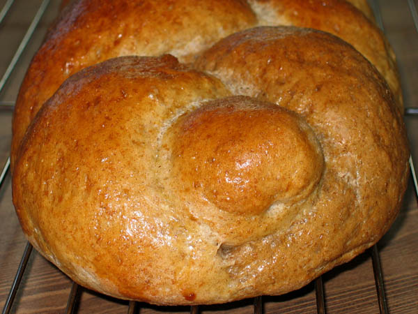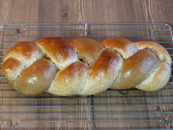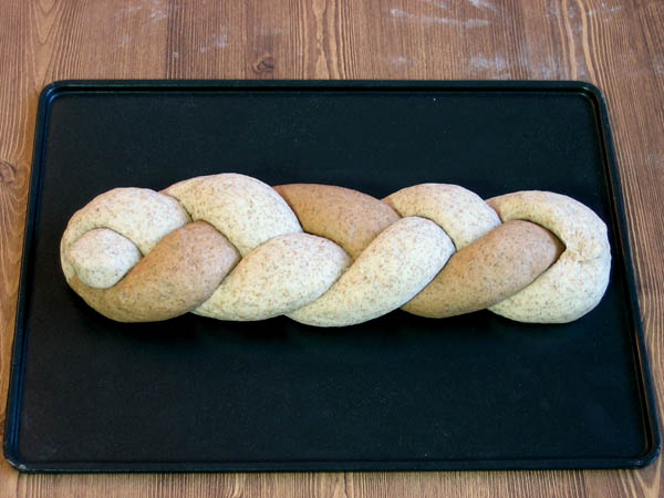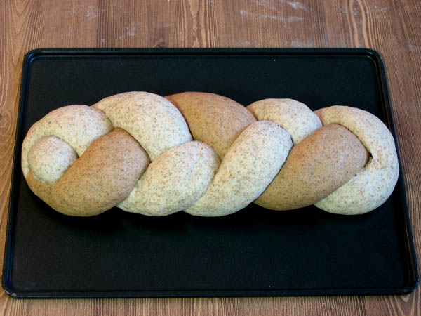 I did take some photos of the braiding process, but decided that they weren’t too interesting. I’ve found that it’s easier to start braids in the middle, flip the loaf 180 degrees lengthwise, and then braid the other half. I flip it lengthwise—that is, end over end—because if you just turn the loaf around 180 degrees you have to braid backwards, and that always confuses me.