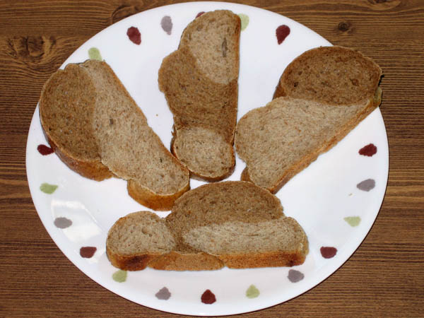 This photo is from the next morning, when I sliced some of the loaf up for toast. Here the difference between the pumpernickel and rye is a lot clearer. Of course, as with all of my culinary adventures, I wish you could taste this one—it is very hearty and makes an excellent toast or sandwich bread (despite the odd shape).