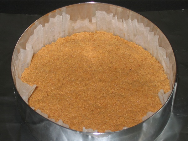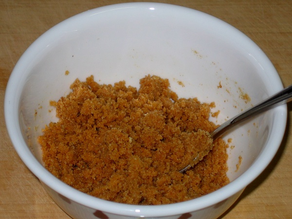 ...and you have the crust mixture. This is actually the unhealthiest part of the cake (the four biscuits have 11 grams of fat, plus all the fat in the butter), so if you’re really health-conscious you may want to skip the crust or replace the Digestive biscuits with Graham crackers (which have roughly half the fat).