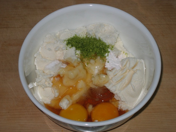 Here are the ingredients for the cheese mixture, waiting to be mixed together. The majority, of course, is ricotta cheese. Two egg yolks sit at the bottom in a pool of honey. The white powder just right of center is vanilla powder, and the white powder to the left of center is table salt. At the top is the zest of one lime—previously I had used orange zest, but all we had on had was limes, so lime zest it was.