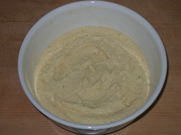 Now, I’m afraid, there is a gap in the photographic record. I was making the cake by myself, which meant that I had to wear both my chef’s hat and my photographer’s hat. This wasn’t a problem up to this point, but the next step required all of my attention (and all of my hands) and couldn’t really be stopped in the middle. If you’ve ever made a chiffon cake (or a soufflé, for that matter), though, you know what’s coming next. I took about a third of the beaten whites and very gently folded them into the cheese mixture with a bowl scraper. I then scraped this lightened (both in texture and density) mixture back into the egg whites bowl and folded everything together. If you haven’t done this sort of thing before, you just cut straight down through the mixture with the scraper, bring the scraper along the bottom of the bowl and up the side, and fold the mixture over itself. The goal is to incorporate the foam into the cheese mixture while retaining as much air as possible, so the fewer strokes you make—and the less time you take—the better. (Hat tip to Martha Stewart, by the way, for the idea to use the chiffon technique; all of the other recipes in my spreadsheet called for simply beating the eggs and then mixing them into the cheese. I imagine this would still taste fine, but it would not result in nearly as light a cake.)