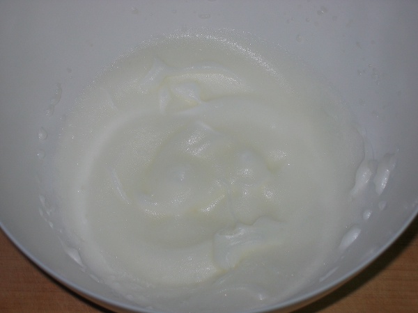 Sharp-witted readers will have noticed that the cheese mixture above contained only two egg yolks—this is where the whites went. I whipped them until the peaks stood up when I removed the beaters. Most cookbooks and recipes use the term “medium-stiff peaks,” which means that the peaks stand up but curl a bit at the tip. When in doubt, beat the eggs less rather than more—if you beat the eggs too long the foam will break and be useless for baking a cake. The whites here are probably somewhere between the “soft peak” and “medium-stiff peak” stage.