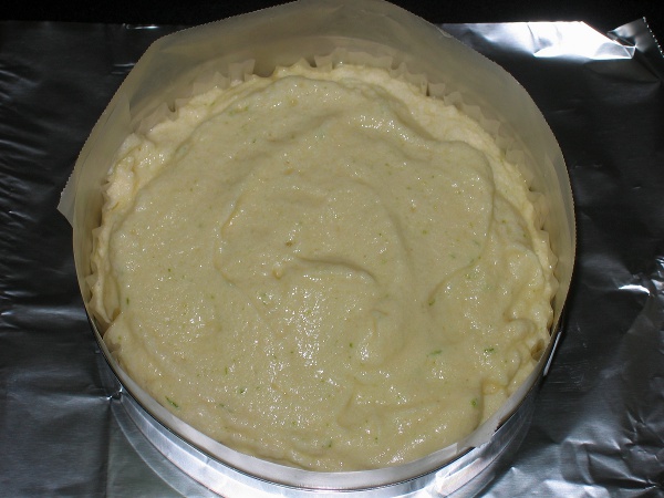 Once the batter was complete I poured it into the frame and quickly snapped a photo before it went into the oven. You’ll notice that I put a waxed paper “collar” around the inside of the frame—from prior experience I knew that the cake would rise over the edge of the liner and stick to the inside of the frame. It’s not that big a deal to run a knife around the inside edge of the frame after it comes out of the oven, but it’s a lot neater to just have the collar there. Of course, it would be even neater to have liners that were the right size, but we don’t live in a perfect world.
