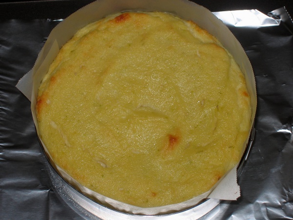 Prepare as described above. Bake the crust alone for 5 minutes at 200° C and the whole cake for 30 minutes at 180° C. Note that this is a fairly small recipe, as I am only using a small (15 cm in circumference and 5 cm in height) cake frame. Doubling the circumference of the frame to 30 cm (with the same height) would require a quadrupling of the recipe. Interestingly enough, a 23 cm frame (or roughly 9 inches, which is what most cheesecake recipes call for) would have to be slightly higher (around 7 cm or so) to hold a triple recipe. (Special thanks for help with the calculations goes to the Wolfram Alpha “computational knowledge engine,” where you can type in something like “volume of a cylinder 23 cm in circumference and 7 cm in height” and get a very thorough answer containing all the information you could ever need.)