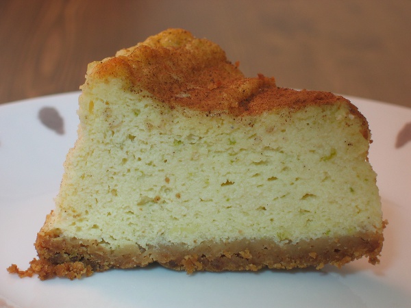 When the frame had cooled enough to handle I slipped it up over the collar and then let the cake continue to cool on the table. Just before we went out for dinner I popped the cake in the refrigerator to chill, and when we came back, having stuffed ourselves with raw fish, wriggling octopus tentacles, and other various and sundry delights, it was ready for serving. I sprinkled some cinnamon on the top and cut it up into eight small pieces, one for each of us with one piece left over. I didn’t get to snap a shot of the whole cake before serving, but I did take a picture of the final piece yesterday, right before HJ and I devoured it.