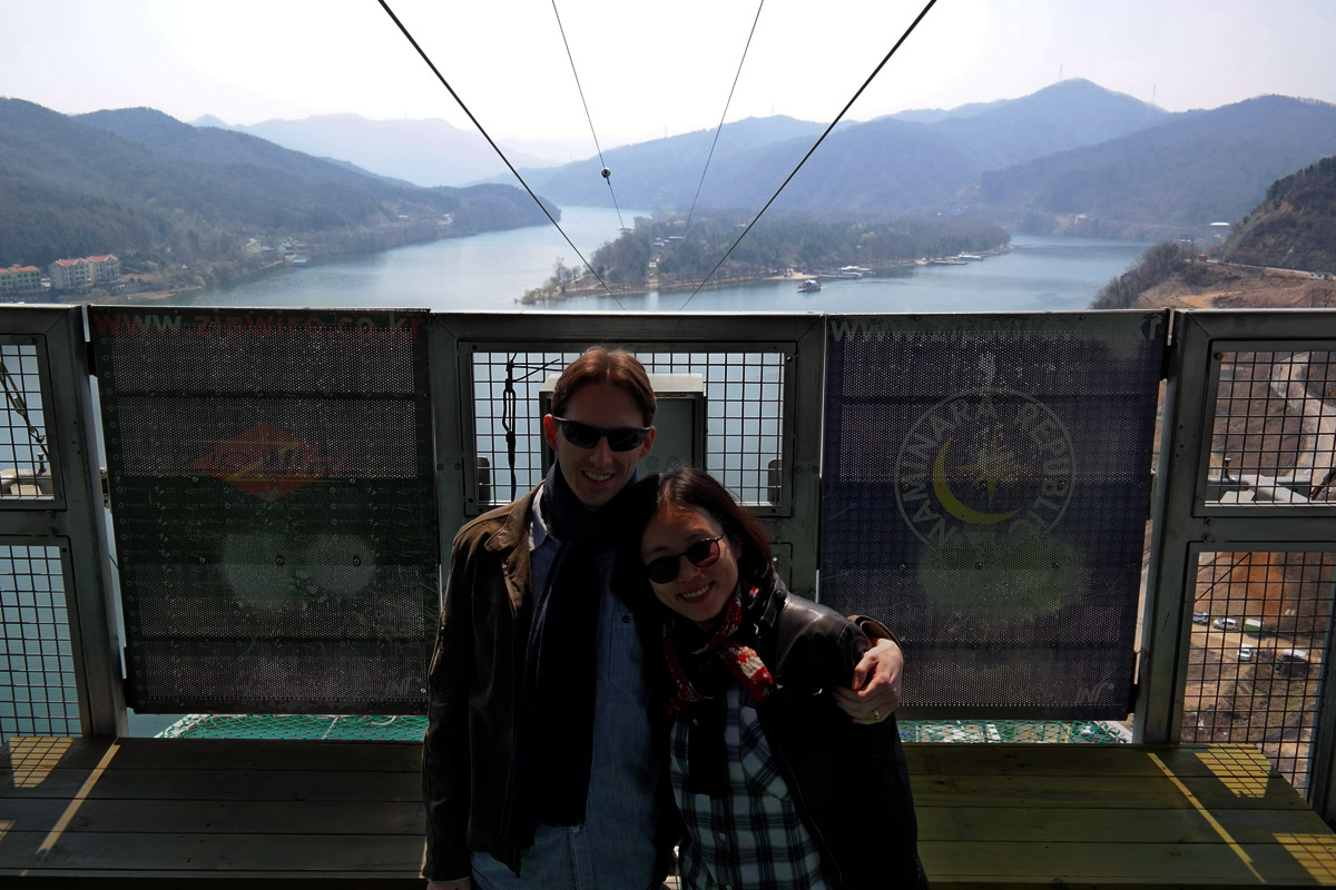 We are standing here on a platform high out over the water, just off the southern shore of the river. Those wires you see above our heads lead to Nami Island in the distance, and we’re about to climb into harnesses and zip wire down. If I remember correctly, the distance is almost a kilometer. There is apparently another course that is shorter but zips along twice as quickly, but that one is only operated on the weekends. This one might not have been as fast, but it was still a lot of fun and definitely the most interesting way of getting to the island.