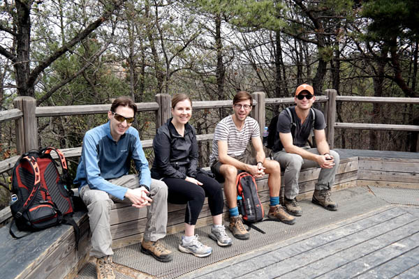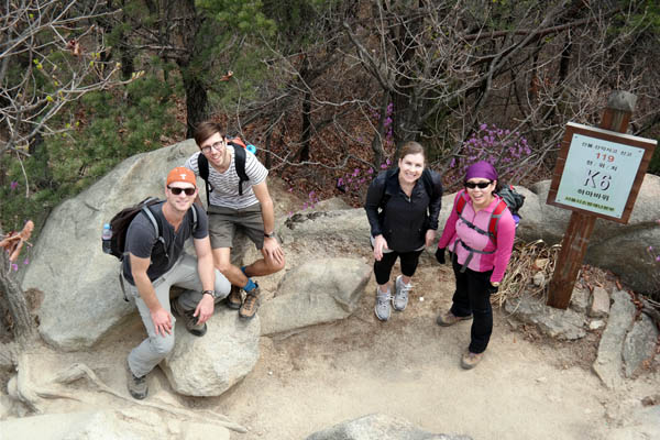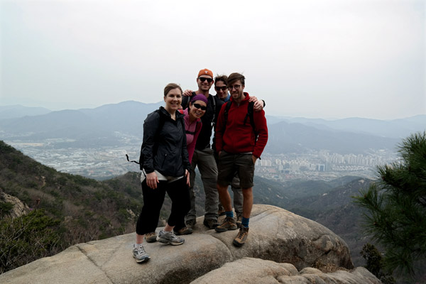 Here, Guy, Raph, and I pose for an 80s album cover next to the rock in the previous photo. We then found a place to sit down and had a snack before heading back down the mountain toward Seoul National University. The way down is not nearly as steep, but it’s still quite rocky, and I was glad to finally get down to the bottom, wobbly legs and all.