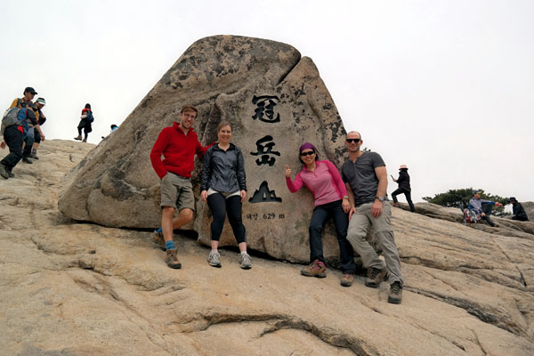 After this the going got even rougher, so I put the camera into my backpack and didn’t take it out until we had reached the top. Some day, when the weather is nice, I want to go back up with the express purpose of taking photos of some of the more challenging sections—because I think Mt. Gwanak, or at least the final “assault” on Yeojudae Peak, might be the steepest climb in the Seoul area. The weather that day wasn’t that great, though, as you can see from the photos, so I figured there was no point in having the camera out and risking another tumble. So here we are (well, not me, of course) after we had reached the top, standing in front of the rock that bears the mountain’s name and its elevation above sea level, 629 meters.