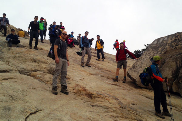 Korean mountains in general tend to be very rocky (lots of granite outcroppings), but Mt. Gwanak is rocky even by Korean standards. I had gotten a little ahead of the pack, and I jumped up onto some rocks to the right of the trail and ran ahead to this point. When the rest of the team caught up, they stopped for a moment and I was able to snap this shot from above.