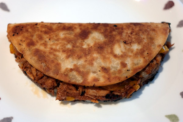 Lastly, this is a sort of epilogue to the weekend, taken a few days later. Kevin had ended up with extra pulled pork on Saturday and gave me a huge ziplock bag to take home. We actually had pulled pork quesadillas two nights last week; this one is from the second batch, which came out much prettier (the first batch I made with two whole tortillas, and they didn’t flip too well). I snapped this photo before we added any toppings so you can see the nice, crispy tortilla.