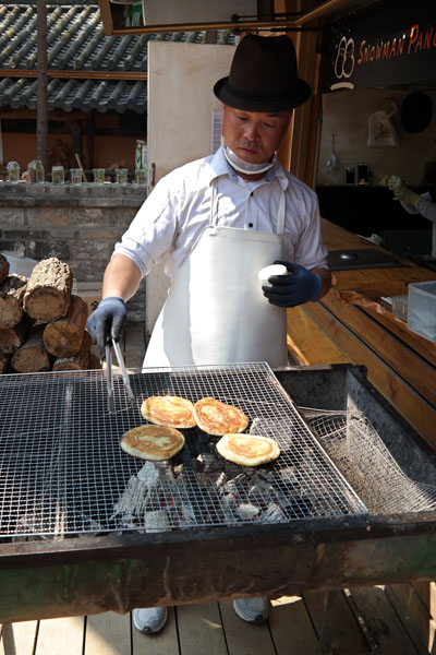This man here is grilling a Korean treat known as “hoddeok,” a sweet pancake filled with brown sugar and nuts (it’s actually originally a Chinese confection, I believe). Even though we were feeling a little peckish, I don’t think we would have normally stopped to buy hoddeok, but these were different—hoddeok normally aren’t grilled, they are cooked on a griddle like pancakes. These were obviously cooked on a griddle first, but cooking them over the coals gave them a nice smoky char that made them unlike any hoddeok I’ve ever had before. They were a novelty, but they were good. I’d have them again.