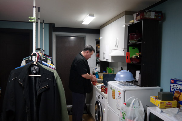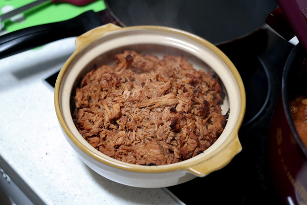 Here Kevin is getting ready to introduce the guest of honor, a healthy portion of pulled pork. I took this photo with my 30mm pancake lens, so it doesn’t give a wide-angle view of the apartment. It’s a studio, but Kevin’s made good use of the available space. I like how he used the clothes rack as both storage and partition, for example (the space on the left is a narrow “hallway” that leads to the bathroom).