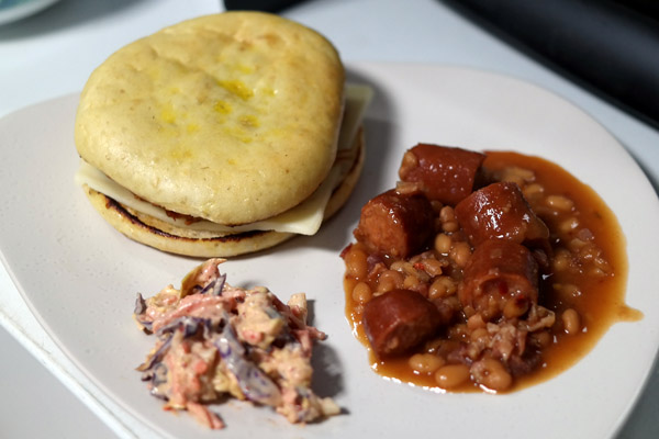 At last, the pulled pork is out of the oven! While this was heating, I cut some rather thin buns I had made for the occasion and crisped them up in a frying pan with some homemade butter that Kevin had (literally) whipped up. To the right of the pulled pork you can see the edge of a pot—that’s filled with the pulled pork’s close friend, some good old franks and beans.