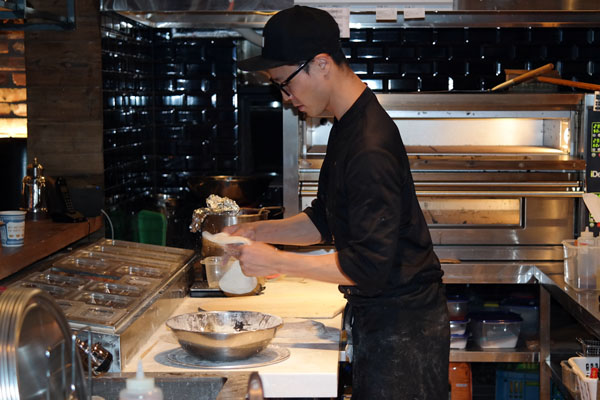 Anyway, I just wanted to explicitly state that I am talking about a particular style of pizza that can be made anywhere, as long as you have the proper ingredients, equipment, and experience. The crust should be thin and properly charred, and it should strike the right balance in terms of rigidity—in other words, it should be rigid enough so that you can pick it up, but it shouldn’t be so rigid that you can’t fold it. There should also be sufficient sauce, and it should be fresh and bright-tasting. As I was discussing with Kevin, this is one big area where I think most Korean pizzas fail: You have the crust (which is usually too thick), and then you have a ton of cheese, and between the two you get a thin red line of sauce that can barely be perceived under the avalanche of melted cheese. Finally, as you might have guessed from the previous sentence, I am not a huge fan of mounds of cheese on a pizza. There should be enough, but it should not overpower everything else. Toppings vary from pie to pie, but you generally don’t want to go overboard with them.