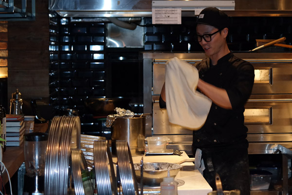 As Eugene got to work on our pies, I got up to snap some photos. Here you can see the chef at work, taking the ball of dough and forming it into a disk. Once this disk is large enough, it is then picked up and shaped with the help of gravity, as seen in the next photo.