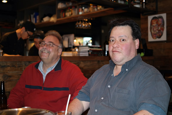 Here we are, back at the table, waiting for our food. Kevin, on the right, is wide-eyed and vibrating in anticipation, while John, artfully captured here in romantic soft focus, blissfully contemplates the gustatory delights to come. (Actually, the focus is a product of the lens I used—I went with my 30 mm pancake, which is better for low-light situations but also has a very shallow depth-of-field. This will be a theme in most of the photos to come.)