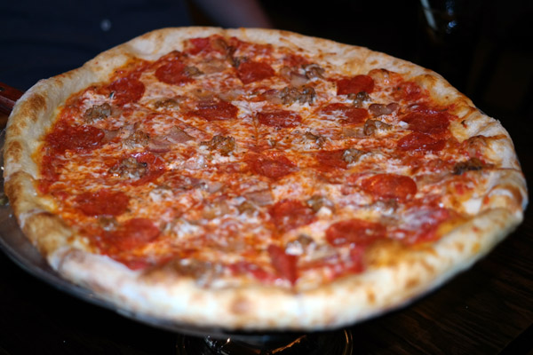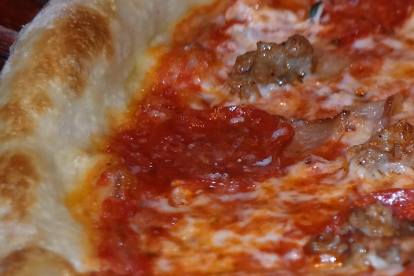 Not long after we finished the wings, our first pie—the large Butcher—emerged and was placed lovingly on its pedestal. First impressions were very good; even before tasting it, the evidence provided by our eyes and noses told us that something special had been brought to the table. You can see—as Kevin pointed out—that real Italian sausage was used, and you can also see that the crust is brown and crispy. What you can’t get from this photo, though, is the smell, and I think that was the clincher—it just smelled like a real NY pizza. To make up for the lack of smell-o-vision, here is a close-up shot of the pie.