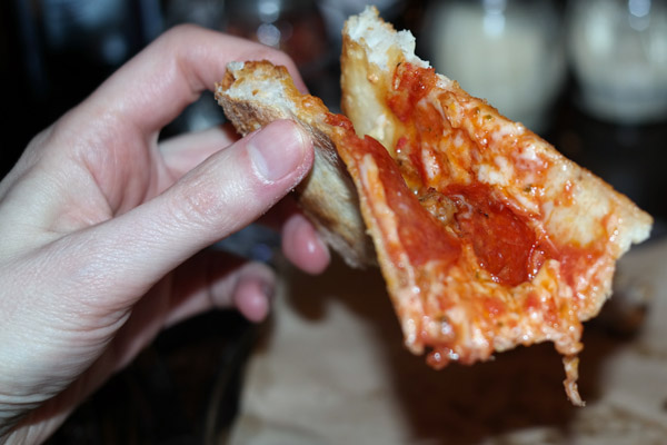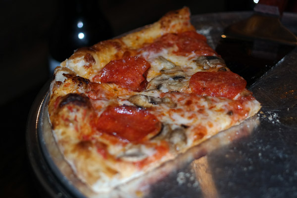 Although the piece in the foreground is mostly out of focus (thanks to that narrow depth-of-field), you can probably tell that the crust on this pie has more charring than we saw on the Butcher. I actually prefer my pizza with spots of charring. I’m not sure what the difference was between the two pies—if the Butcher was indeed brushed with olive oil, I wonder if that might have prevented or at least retarded charring. Truth be told, though, I didn’t notice this until later; I was too busy scarfing down the Butcher to notice the lack of black spots.