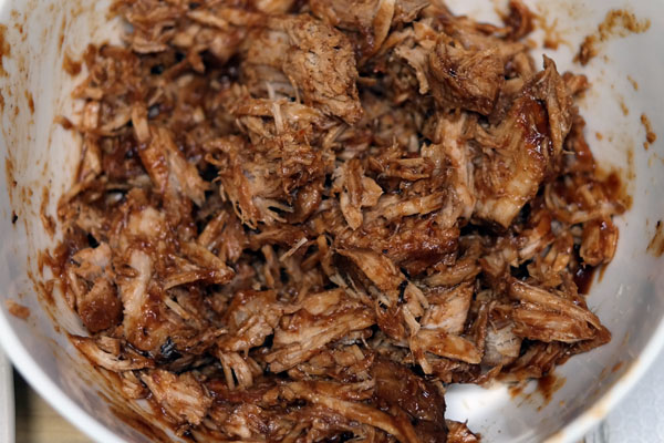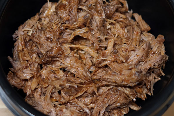 I will admit that I had to bend down and take a closer look, but after a moment I made my choice and quickly followed it with, “Am I right?” I was, and my culinary pride remained intact. How about you, dear reader? Did you guess that the pulled pork in the black bowl was the shoulder? They may look similar at first (which is why I had to take a closer look), but you can see that the meat in the white bowl is definitely more fibrous, despite there being some shoulder-like chunks.