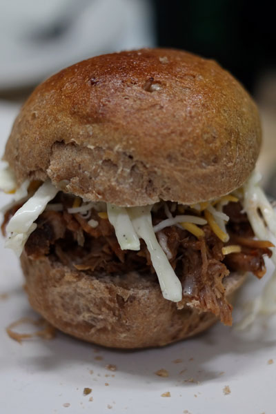 That’s my final slider there, on my whole wheat and teff slider bun (80% whole wheat flour, 20% teff flour, and some toasted sunflower seeds thrown in for a change in texture). Believe it or not, I actually ended up eating more of the pulled pork than Kevin—I had three sliders to his two.