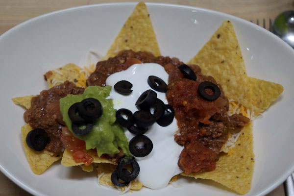 The next course was nachos—triangular tortilla chips smothered in homemade chili, sour cream, guacamole, and a homemade salsa that had just the right amount of heat. Kevin apologized for the guacamole not being homemade, although I wasn’t too surprised to hear it. When I read that he was planning to make guacamole with an avocado he had bought the day before, I figured there was no way it would be ripe enough yet. And I would say that the chili and the salsa more than made up for it.
