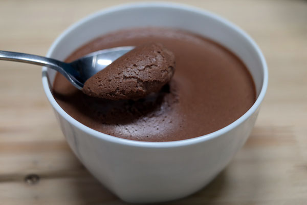 Anyway, after a considerable break we returned to the trough. There was no way I was going to be able to do another course, though, so we skipped straight to dessert, Kevin’s chocolate mouce. He plunked down two rather large bowls filled with enough mouce to smother a baby.