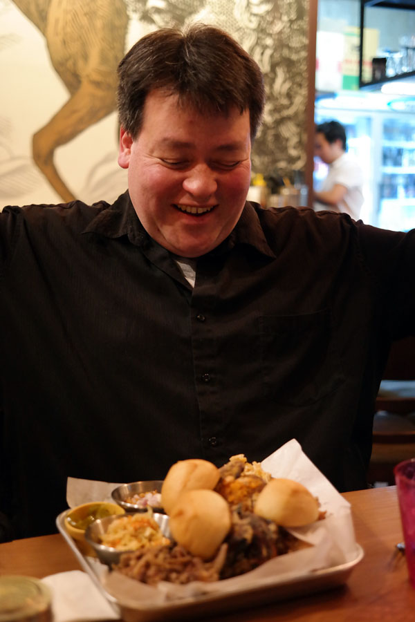 While we waited for our food, Kevin tried the various sauces. There were three sauces on the table: Tuscaloosa sauce, Sweet Cola sauce, and Alabama White Sauce. Here, Kevin is sampling the Tuscaloosa sauce, which is a spicy (but not necessarily hot) cumin-flavored sauce. The Alabama White Sauce was a vinegary mayonnaise-based sauce that I liked a lot. I had heard about the cola sauce and wasn’t particularly keen on the idea, but it turned out to be not nearly as sweet as I thought it would be, and was in fact quite nice. I would not recommend squirting it directly into your mouth, though, as Kevin did.