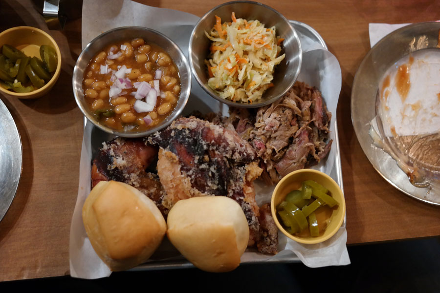When it came time to order our meals, we each went with the “Taste of Alabama Platter,” which is a platter of pulled pork, smoke fried chicken, side dishes, and bread. There are three different sizes: regular (100 g of pork, half a chicken, and two sides), large (200 g of pork, a whole chicken, and three sides), and OMFG (300 g of pork, 1.5 chickens, and four sides). HJ and I got a regular to split, Tom and Patrick got a large to split, and Kevin got a large to split... with himself. For our two sides we got whiskey beans and cole slaw—there was also mac & cheese, which the others got, and two other side options as well. Suggestion: Put the side dishes on the menu! It could just be because my brain was fried after a long day, but I had to ask our waiter what the sides were twice.