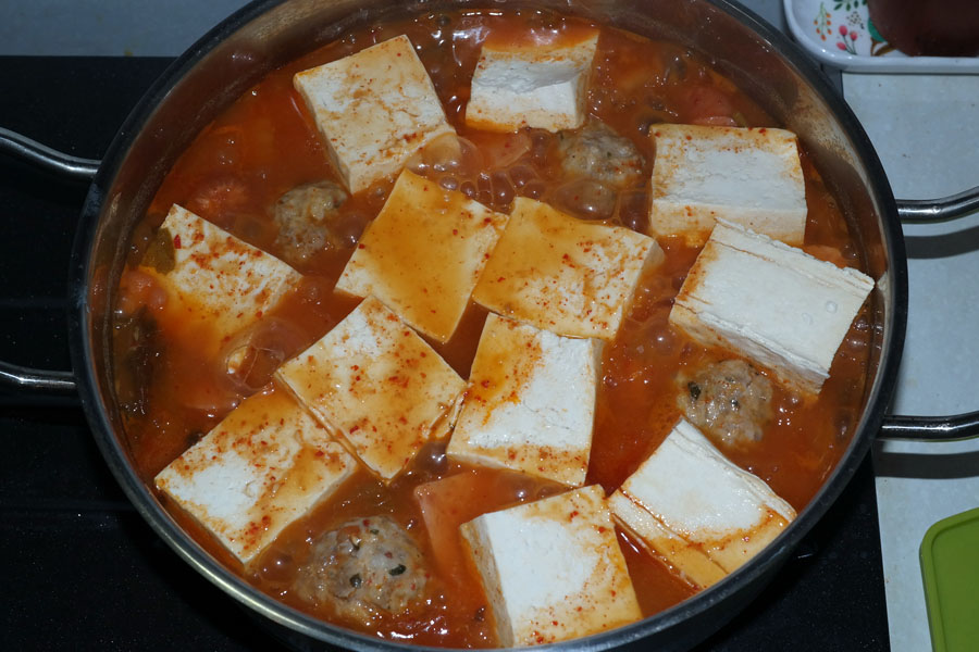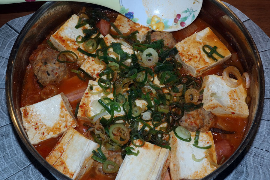 In terms of vegetable matter, I think you’ve got to have kimchi. It is the combination of kimchi and pork products that lie at the heart of this dish, as far as I’m concerned. Once you’ve got the kimchi, you can kind of do whatever you want in terms of vegetables, but green onions seem to be a popular ingredient that I also like. Ramyeon (ramen) noodles and tteok (glutinous rice cakes) often make an appearance as well, but I prefer to avoid starchy ingredients like this, as budae jjigae is already served with rice on the side—I don’t think you really need that much more in the way of carbs. I do make an exception for baked beans, both because they add a subtle sweetness to the dish and because they feel “traditional,” being another food introduced by US GIs. I also like to add tofu to take the place of starchy components like tteok. One advantage of tofu over tteok or ramyeon noodles is that it doesn’t absorb moisture and become fat and soggy—you can’t really save leftover budae jjigae with ramyeon or tteok in it, or you’ll find yourself with a bowl of unappetizing sludge.