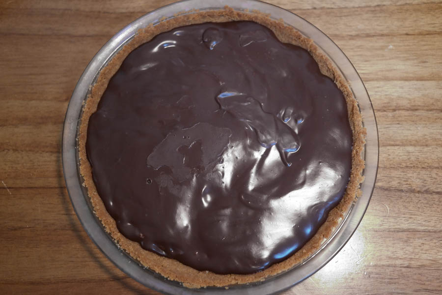 The filling then went into the pie crust, which in turn went into the refrigerator for about three or four hours, I think. At the end of that time I made my tried-and-true ganache, using equal parts (by weight) dark chocolate and cream. I was using chocolate “buttons,” which I suspect would probably melt just fine with the addition of boiling cream, but the finer you chop your chocolate the quicker everything will come together, so I took a knife to it. As I did this, I was once again reminded of an interesting property of chocolate, namely that it builds up quite a static charge when you chop or grate it, so any shavings you get tend to fly off the blade rather than fall neatly into the bowl. Once I had wrangled all my chocolate into the bowl, I boiled the cream, poured it on, and then set the timer for three minutes. I don’t know if I ever experimented to find out if this is the ideal time, but it seems to work for me—it’s long enough to melt the chocolate, but not so long that it cools down too much.