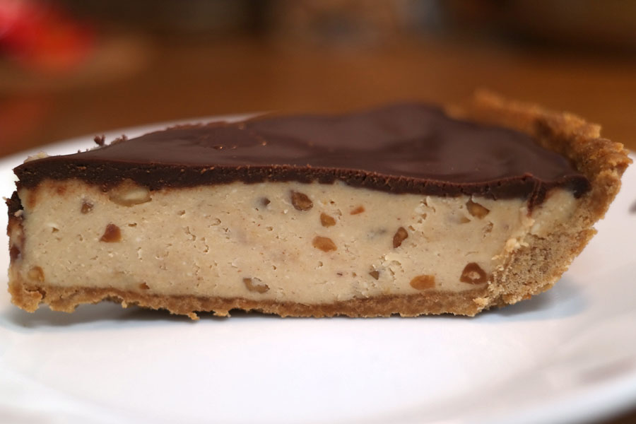 This is a cross-section of a slice to give you a better idea of how it came out. This particular slice is actually from the day after, as it seemed to cut better after spending an entire day in the refrigerator. If you’re wondering what those little chunks are, well, they are peanuts! Strangely enough, every recipe for peanut butter pie I found on the internet specified creamy peanut butter, but both HJ and I happen to like chunky peanut butter—and the chunkier the better. I would recommend going chunky, as this adds a textural contrast to the filling in addition to the crunch of the crust. If you like your pie fillings bland and uninteresting, though, feel free to go creamy (false dichotomies for the win!).