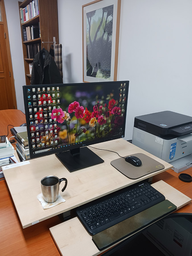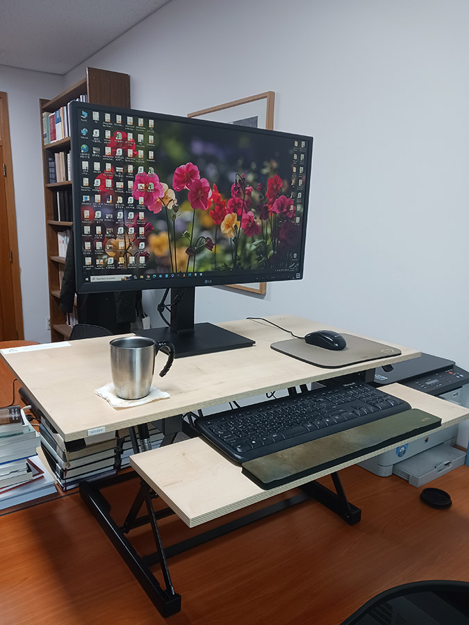I wanted to write about something other than my busy schedule today, though. This all goes back to my medical examination at the end of last year. No, there were no unpleasant surprises; the results were pretty good news all around. I was pleased to see that my biological age is 44, for example. Considering the fact that I am going to be 51 in less than two months, I thought that was not bad. As part of the checkup, though, I had to fill out a questionnaire about my lifestyle, and the one thing that struck me was just how much time I spend sitting. I do walk to and from school every day, a round trip of five kilometers, but once I get there, if I am not teaching class or doing something else I am sitting on my rump in front of my computer. We all know by now that spending most of your day sitting is not good for your health, and although I wasn’t reprimanded by the doctors for spending so much of my day seated (probably because it’s not unusual here), I realized that something had to change. I mentioned this in passing to a student who had come to my office to talk about her dissertation and she said, “That’s why I got a standing desk!”
