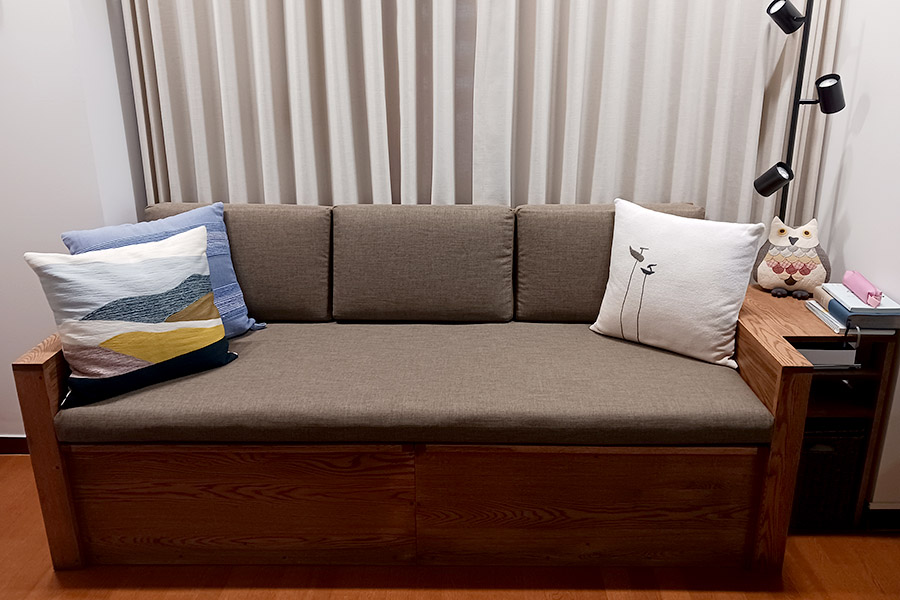 So, we had our couch, but it was basically just a hardwood bench at this point. The next step was to make the cushions for it: one long cushion for the seat and three smaller cushions for the back. Dividing the back into three separate cushions was HJ’s clever idea—arranged horizontally, they would cover the back of the couch, which came up to a little below our shoulders, but if we wanted to lean our heads back we could just flip the cushions vertically to get that extra height. Until we got the cushions, though, we basically grabbed every cushion, mat, and extra pillow we had in the house and sat on those. It wasn’t great, to be honest—even with the cushions and padding, it wasn’t the most comfortable seating arrangement.