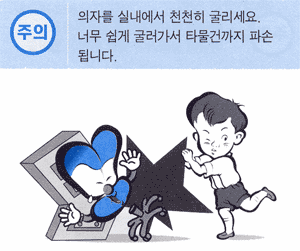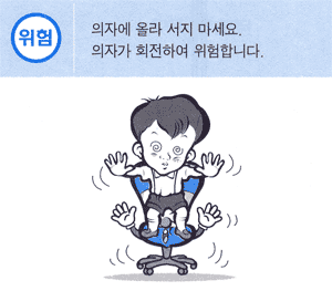 Babelfish is obviously trying to tell us that the chair refuses to fling Fruit Roll-Ups, and we all know that most reasonable chairs will not hesitate to fling Fruit Roll-Ups with abandon. Actually, Babelfish is inexplicably confusing the Korean construction for “do not” with the verb “to roll up,” so Fruit Roll-Ups will be featuring prominently in Babelfish’s version of these warning messages.
