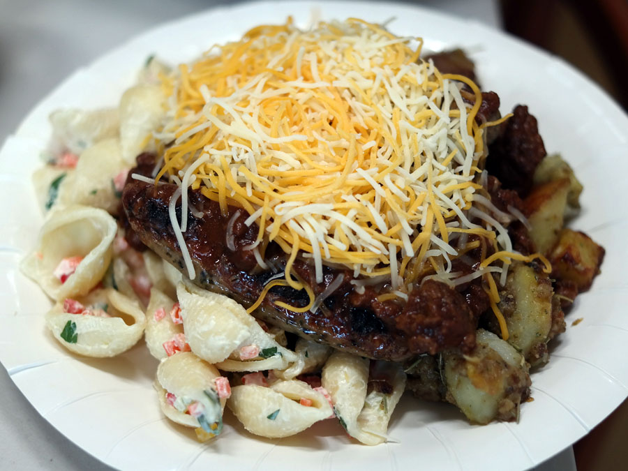 At any rate, a garbage plate is a combination of various different foods: pasta salad, potatoes, sausages, and meat sauce. To that, Kevin added shredded cheese, which is always a good call. This was my plate before I dug in (and before the cheese melted).