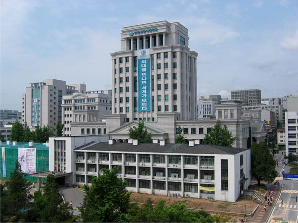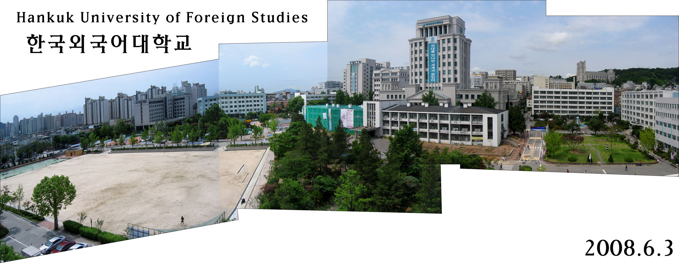 In fact, you can see almost the entire campus in this collage. The only buildings you can’t see are the publishing office, the graduate school building, my building (obviously), and the professors’ research building (that one is mostly hidden behind other buildings). As for the buildings you can see, the new administration building is the most prominent—it’s the tall one in the second photo from the right with the banner hanging down the front (the banner reads: “When you meet HUFS, the world comes into view”). In front of the new administration building is the old administration building—the section on the left is wrapped in green cloth ostensibly because it will eventually be torn down. To the right of the new administration building, behind the green area, is the humanities building. Moving clockwise we then have the audio-visual education center and the foreign language study and evaluation center (not sure if that’s the official title in English).