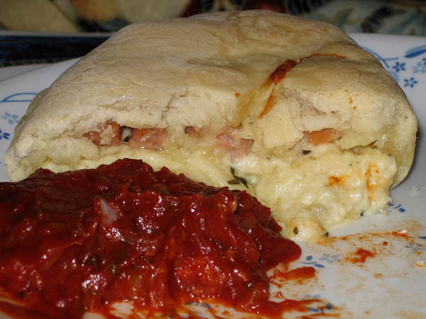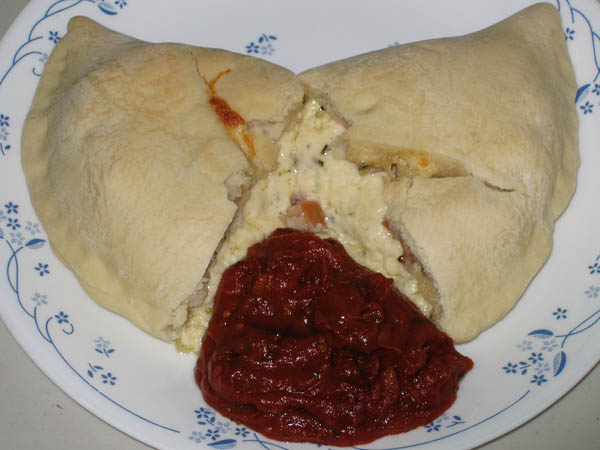 Finally, here is a close-up of one half of the calzone so you can see the gooey innards. It’s a bit crushed from being cut in half, but it is a meal, after all, and not a work of art.