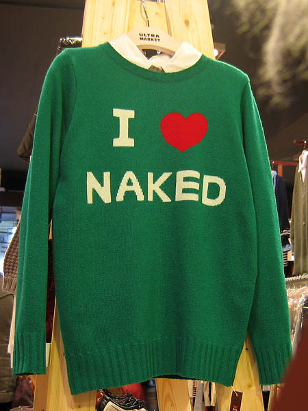 But that’s not the point of today’s quick note. While we were waiting for a table, we wandered around the immediate neighborhood. Even though it’s been fairly warm lately, we had spent most of the afternoon outside and were starting to get chilled, so we spent a lot of time popping in and out of various stores. We were in one clothing store when I turned around and saw something that made me laugh aloud. Fortunately, I had my camera with me. To be discreet, I turned off the flash, balanced it on a shelf, and took the following picture that I wanted to share with you.