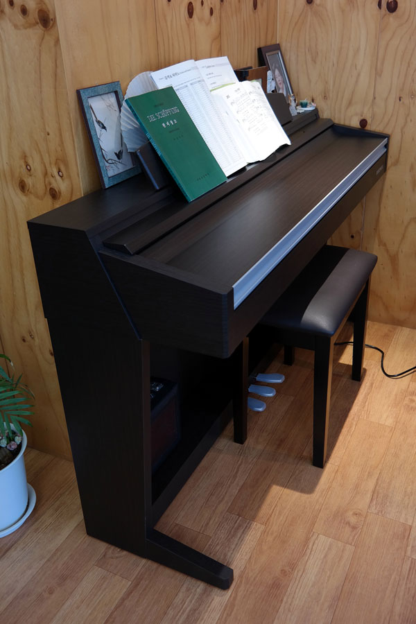 To the untrained eye—like, for example, mine—that may look like a strangely angular upright piano, but it is actually a Kurzweil digital piano. Thus it is not only capable of sounding like a grand piano, it is capable of sounding like about a dozen or so other types of pianos as well. In fact, it has as many “voices” as there are keys on the piano. These voices range from percussion to “80s synthesizer” to a reproduction of the piano heard on EPs by the band Supertramp (no, really).