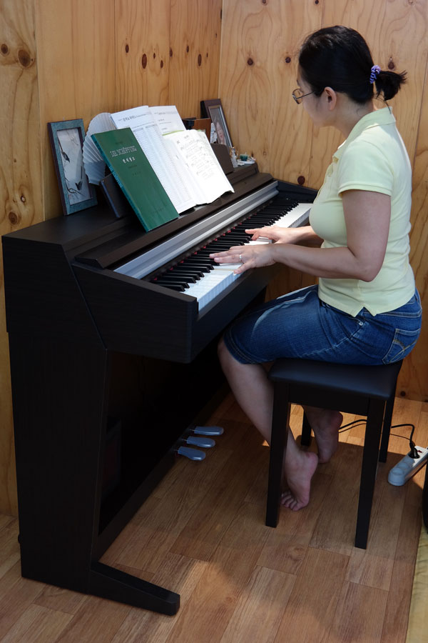 Those are the keys, of course, and it’s hard to tell from the photo, but they are real piano keys weighted to feel like they are attached to a real piano. HJ says that it doesn’t “sound” quite the same as a real piano when played, but I think what she means is that it doesn’t “feel” like a real piano. A real piano is a percussion instrument, and when you play it you get real tactile feedback—not just the sound, but the vibration and resonance of the instrument. Apparently you do get some of that if you turn the volume up, but we live in an apartment and would like not to be hated by our neighbors, so we keep it down. Still, I think it sounds pretty good, and it’s nice to have a piano in the house for HJ to play.