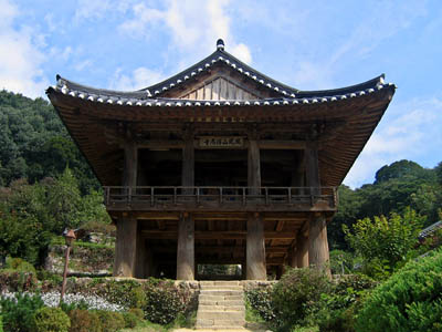 This is a two-story pavilion beneath which visitors pass in order to enter Buseok Temple. The plaque beneath the roof says “Bonghwangsan Buseoksa,” or “Mt. Bonghwang Buseok Temple.” Buseok Temple was built in 676 by Uisang and is where the Flower Garland Sect (Hwaeomjong) originated in Korea. The various buildings have been rebuilt and repaired over the years.
