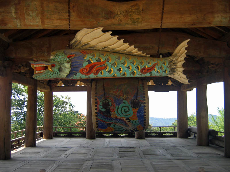 This is the second story of the pavilion seen in the previous photo. In the foreground is the “wooden fish” (mogeo) and in the background is the “dharma drum” (beopgo). The sounding of the dharma drum is thought to spread the teachings of Buddha to all humanity. The wooden fish has a hollow belly that is open at the bottom, and the insides of the belly are struck with a wooden stick. Its function is to drive away sleepiness and focus the scattered mind—the open eyes of the fish (fish have no eyelids) are symbolic of this wakefulness and awareness. The hollow wooden gongs struck by monks are said to be simplified versions of the fish.