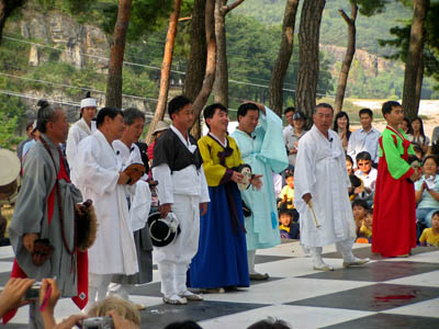 At the end of the mask dance, all the actors came out and took off their masks. I’ve seen the Gangneung Gwanno Mask Dance on a number of occasions, and the audience always laughs when the female character takes off her mask... to reveal that “she” is actually a man. The same thing happened here. It’s not just the mask and the clothes, though—the actors who play the female parts do such a good job acting that it’s easy to be fooled.