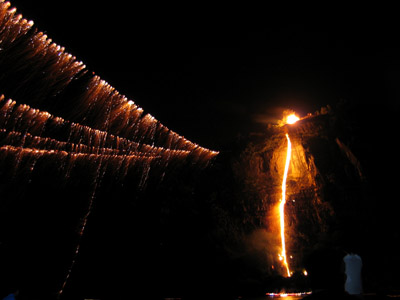 Toward the end of the display, they throw bundles of flaming wood and brush off of the cliffs and into the water. That streak of light on the right is one such bundle. Everyone on the beach would shout “Nakhwaya!” (which means “falling fire!”) and then they would throw the flaming bundles over the edge.