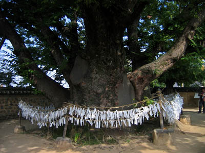 This is the dangnamu, or “shrine tree,” where the village guardian deity is said to reside. The white strips of paper hung around the tree are the prayers of the villagers (and no doubt the many tourists who travel here).