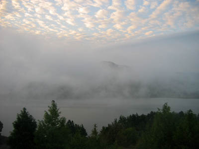 The hotel we stayed out looks out over a lake, and when we woke up the next morning it was covered in fog. I got this photo as the fog started to break—it may look like a photoshopped picture, but that’s actually what it looked like. It was quite surreal.